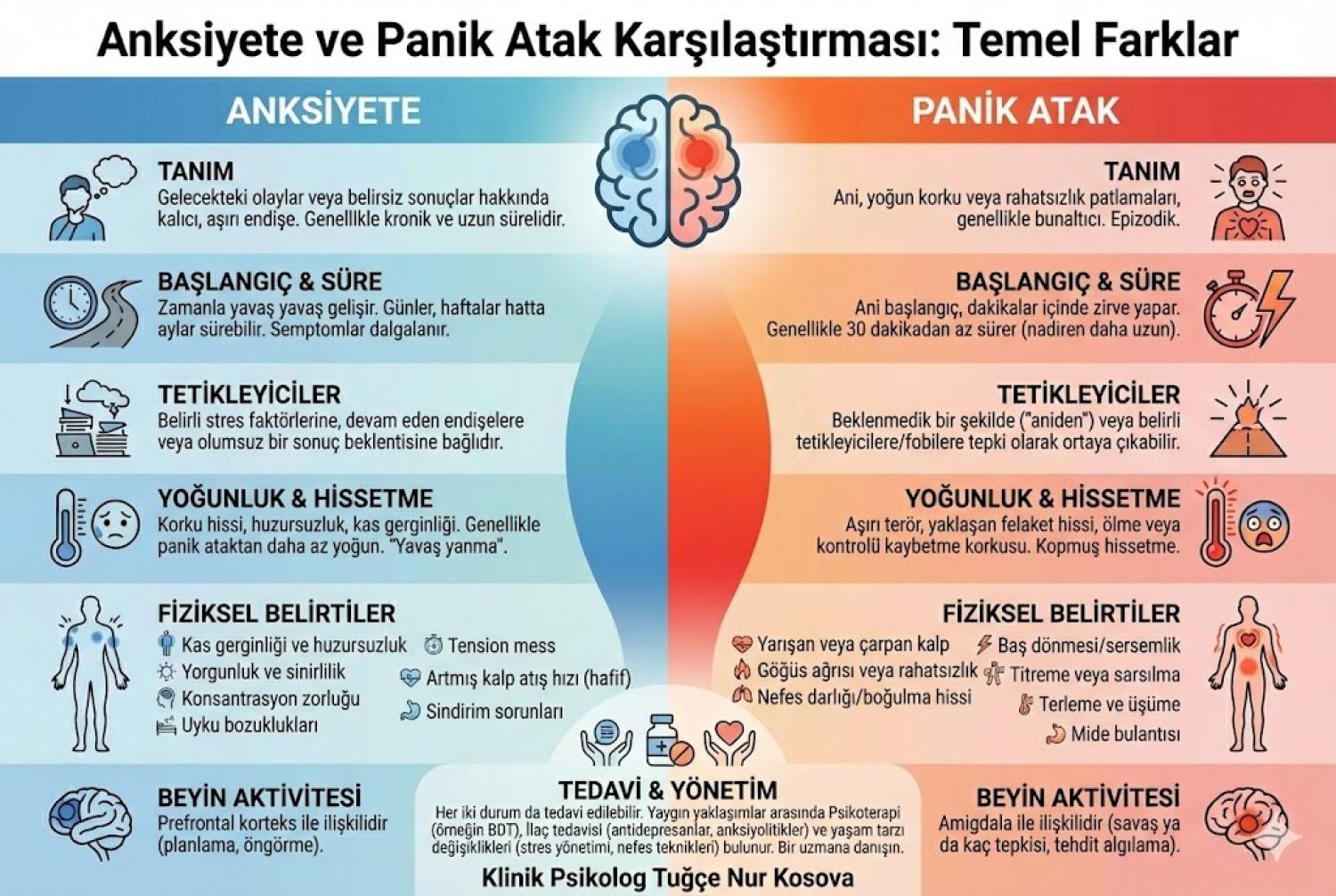 Kaygı ve panik atak sık sık birbirine karıştırılan iki psikolojik durumdur. Bir kişi yoğun stres altında nefes darlığı, çarpıntı, titreme veya yoğun korku hissettiğinde çoğu zaman “Panik atak mı geçiriyorum?” ya da “Kaygı seviyem mi yükseldi?” diye düşünür. Oysa bu iki durum hem belirtiler, hem süre, hem de tetikleyiciler açısından birbirinden farklıdır. Özellikle büyükşehir yaşamının yoğun olduğu İzmir gibi şehirlerde, iş temposu, sosyal baskı, ekonomik kaygılar ve gündelik stres faktörleri kaygıyı artırabilirken; panik atak daha ani, kontrol dışı ve yoğun bir kriz şeklinde ortaya çıkar. Bu yazıda Kaygı ve Panik Atak arasındaki farkları, belirtileri ve doğru tedavi yaklaşımlarını Klinik Psikolog Tuğçe Nur Kosova perspektifinden detaylı bir şekilde ele alıyoruz.